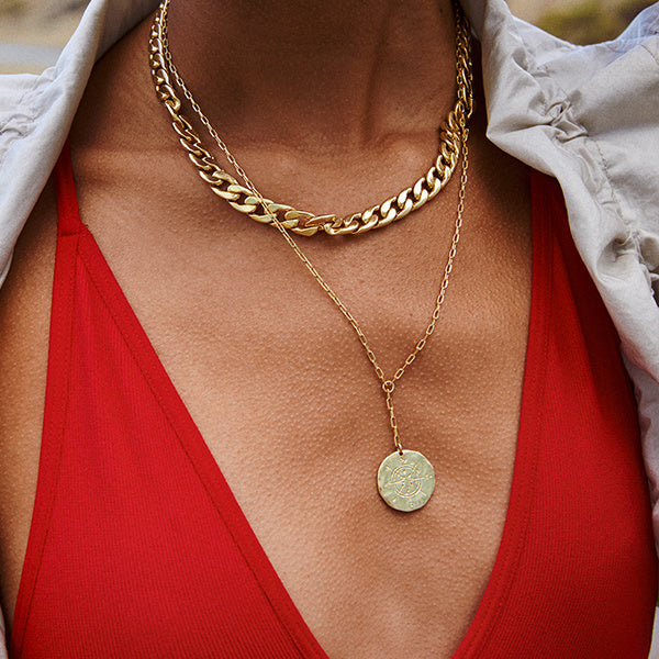 A necklace set composed of two curb chain necklaces for an elegantly edgy summer look inspired by the element of Water. The polished chains capture the sunlight like ripples on a windswept sea.